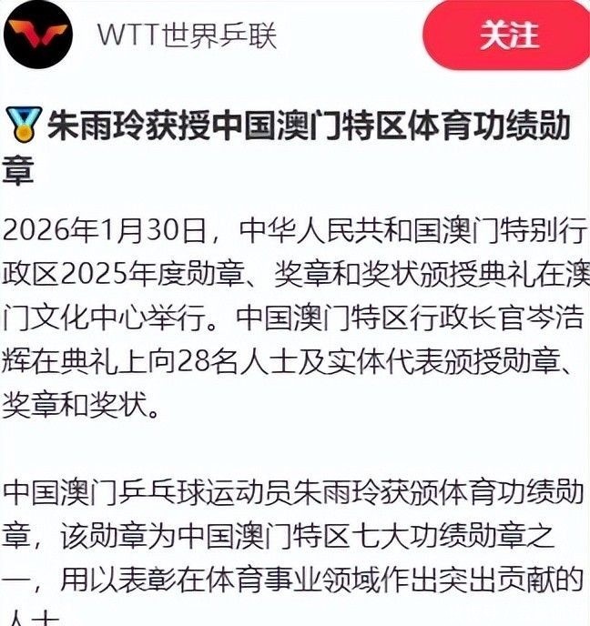 1月30日授勋典礼上,澳门特区政府颁奖词写道:“朱雨玲所展现的不懈奋斗与自我超越,正是奥林匹克精神与中华体育精神最生动的当代注脚。”