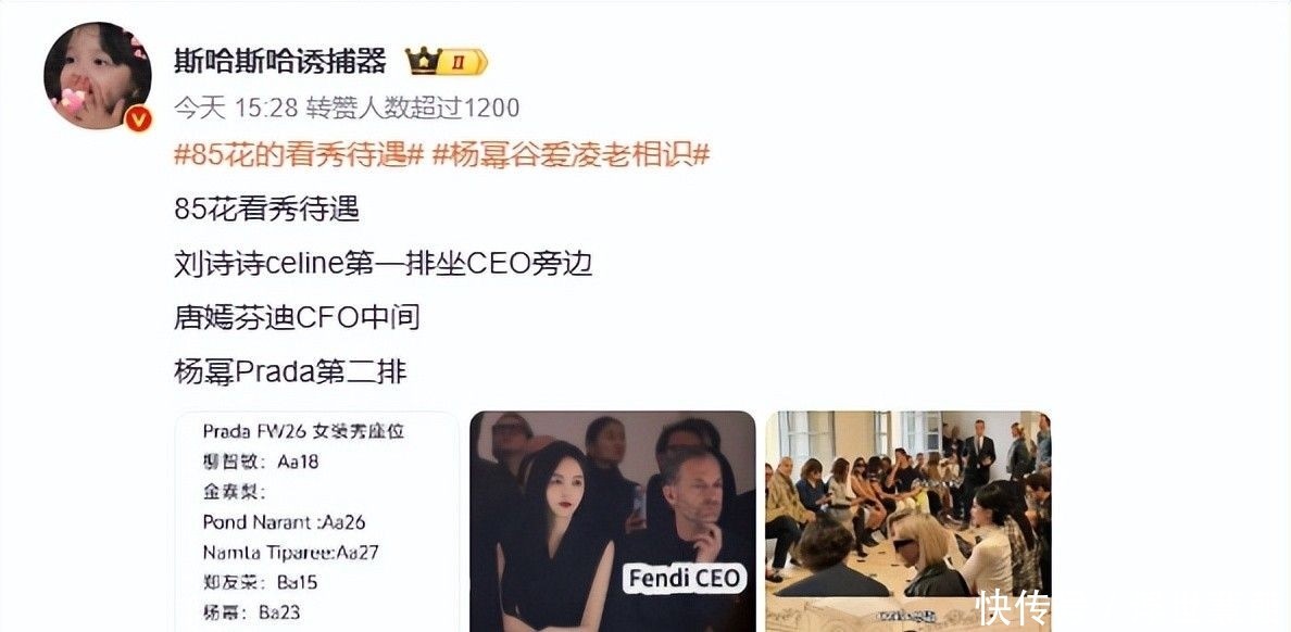 尽管身为Prada全球品牌代言人,她却出现在秀场第二排区域,部分网友指出其席位甚至低于多位韩国新生代女团成员,亦有镜头捕捉到她与刚签约不久的新人模特并肩而坐的画面。